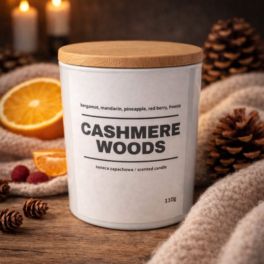 Świeca zapachowa CASHMERE WOODS 10% – białe szkło